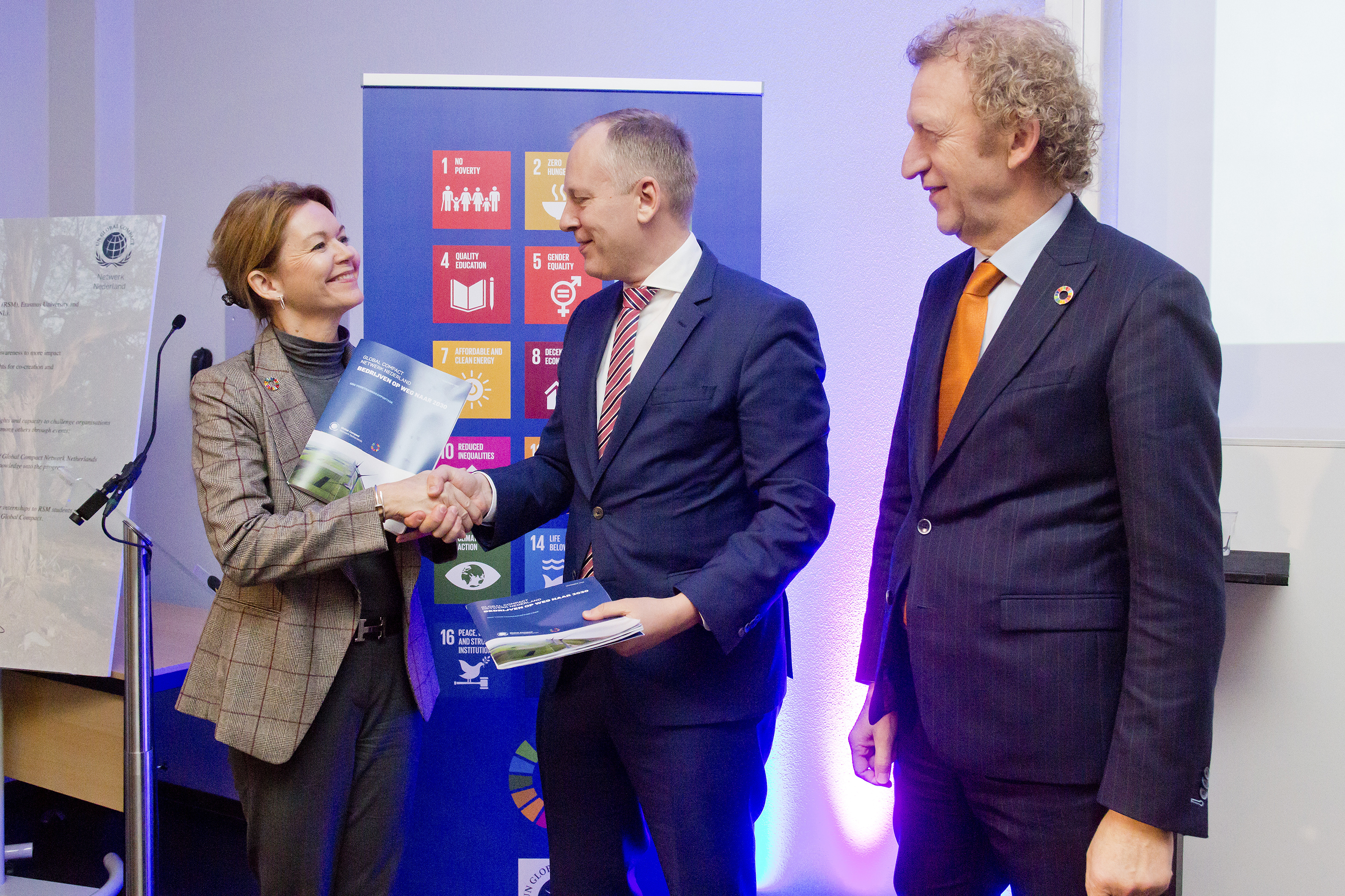 Chairman of Global Compact Network Netherlands Jan-Willem Scheijgrond handed out the first copies of a report on Dutch companies' progress on the Global Goals to Lise Kingo, CEO & Executive Director of the UN Global Compact and Hugo von Meijenfeldt, SDG Coordinator of the Dutch Government.